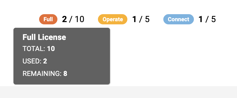 To track your available and used licenses, you may refer to the License Tracker at the top of the Users page. Hover over the label to view how many total licenses your domain has been assigned, and how many are used vs. remaining.