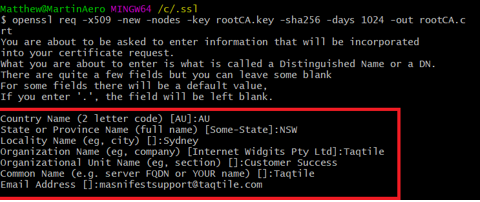 - You will be prompted for info like country code, state, email, organization name and Common Name. This can normally be anything as this certificate is not going to be publicly distributed.