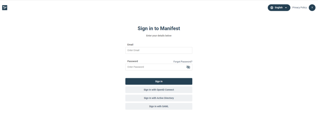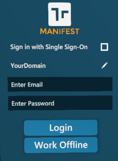 To login to the Manifest Web Application, go to the unique URL for your Manifest domain (this was provided in your new user ‘Welcome to Manifest’ email. You will be prompted for your email address and password to sign in, unless you are signing in with Active Directory. If your domain requires, you may also be prompted to accept an End User License Agreement.