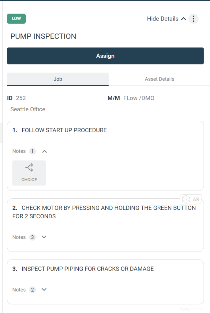 - When AR content is available in a Job, an AR icon will be displayed in the upper-right corner of the Step. (Note that the Web application is not AR enabled. Any spatially anchored Steps or Notes must be viewed from an AR enabled device, such as Manifest 3D or Manifest iPadOS)