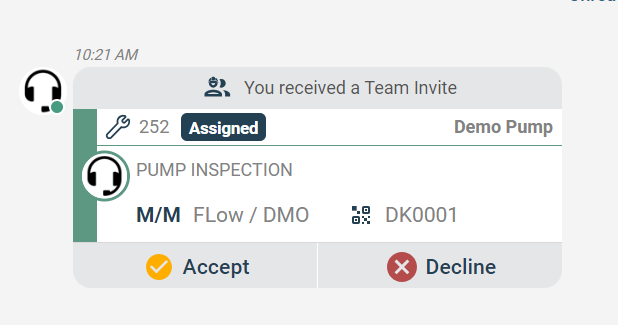 - If a Job is assigned to an Operator, an assignment invite will be sent to the assigned Operator via a Manifest Connect Chat (the Work Card includes important details about the Work item and any pertinent information with the options to Accept or Decline).